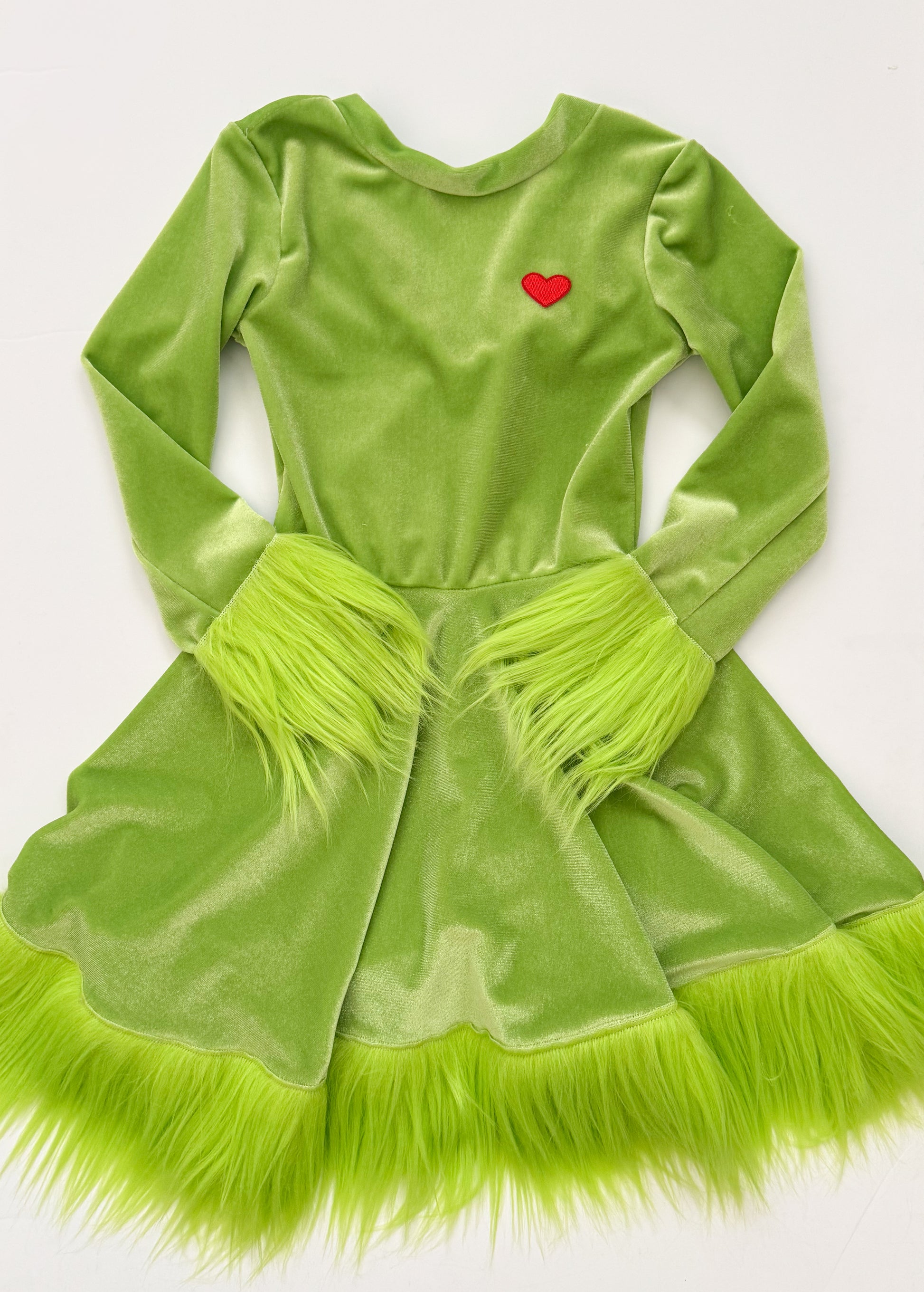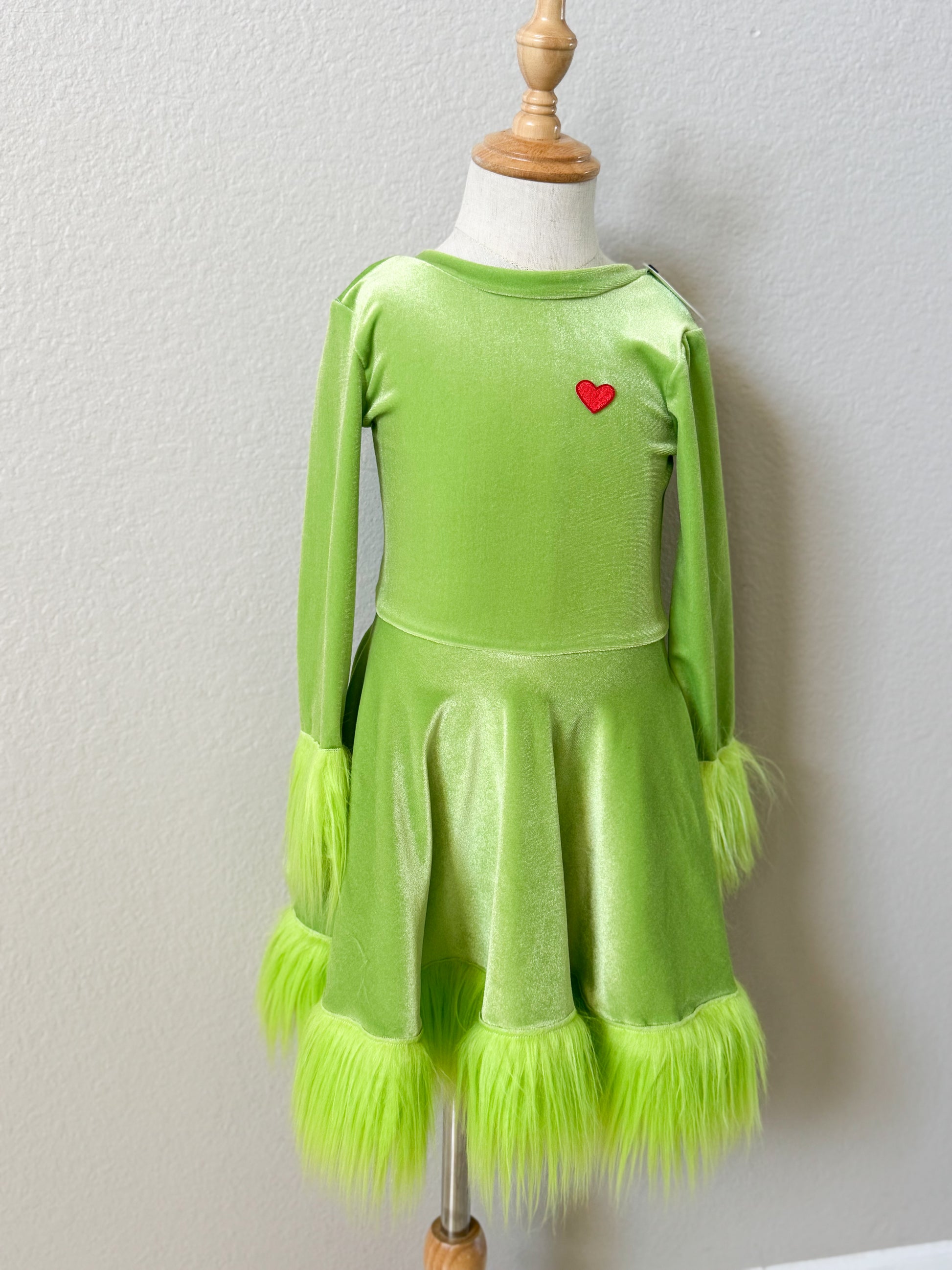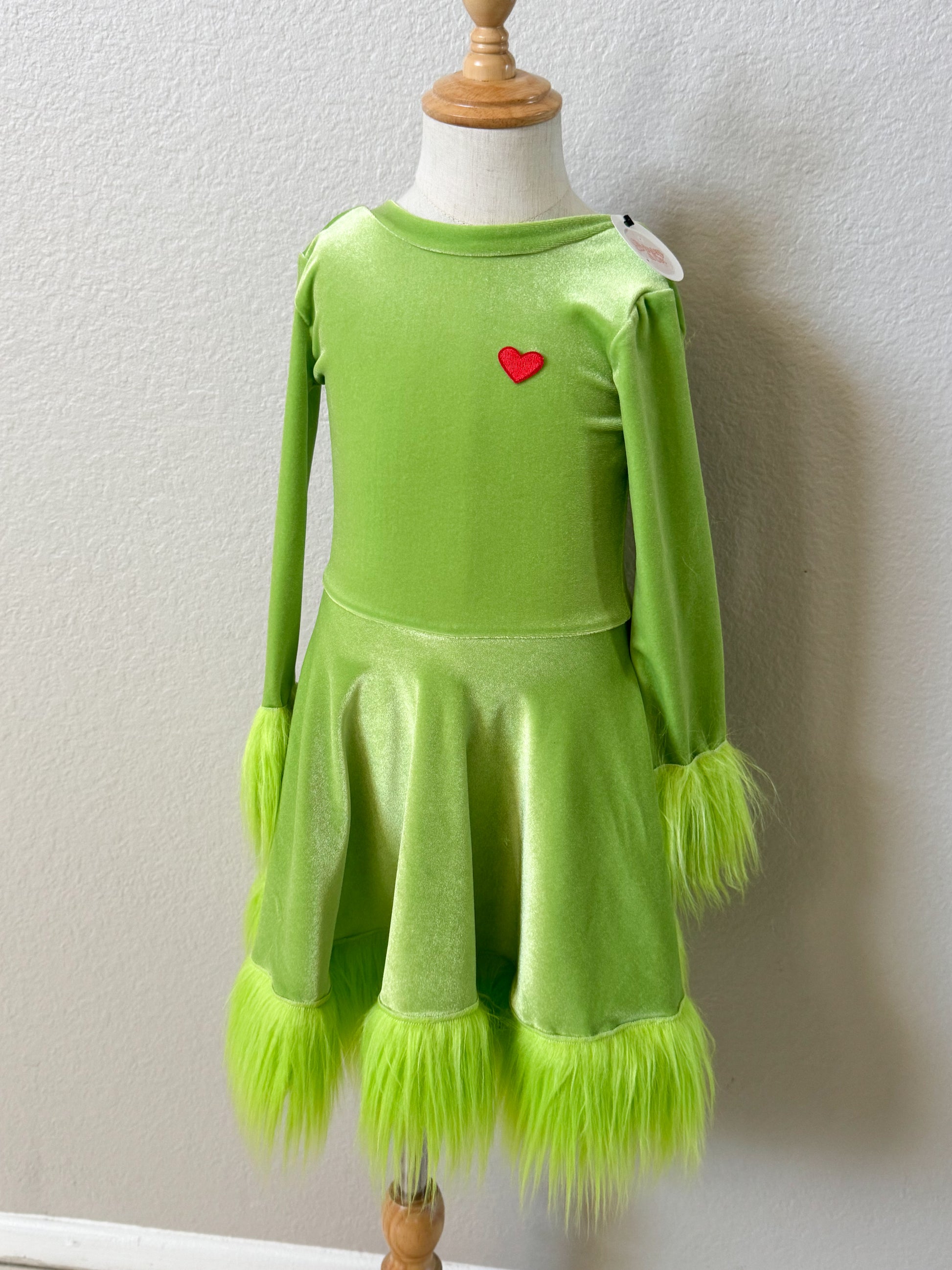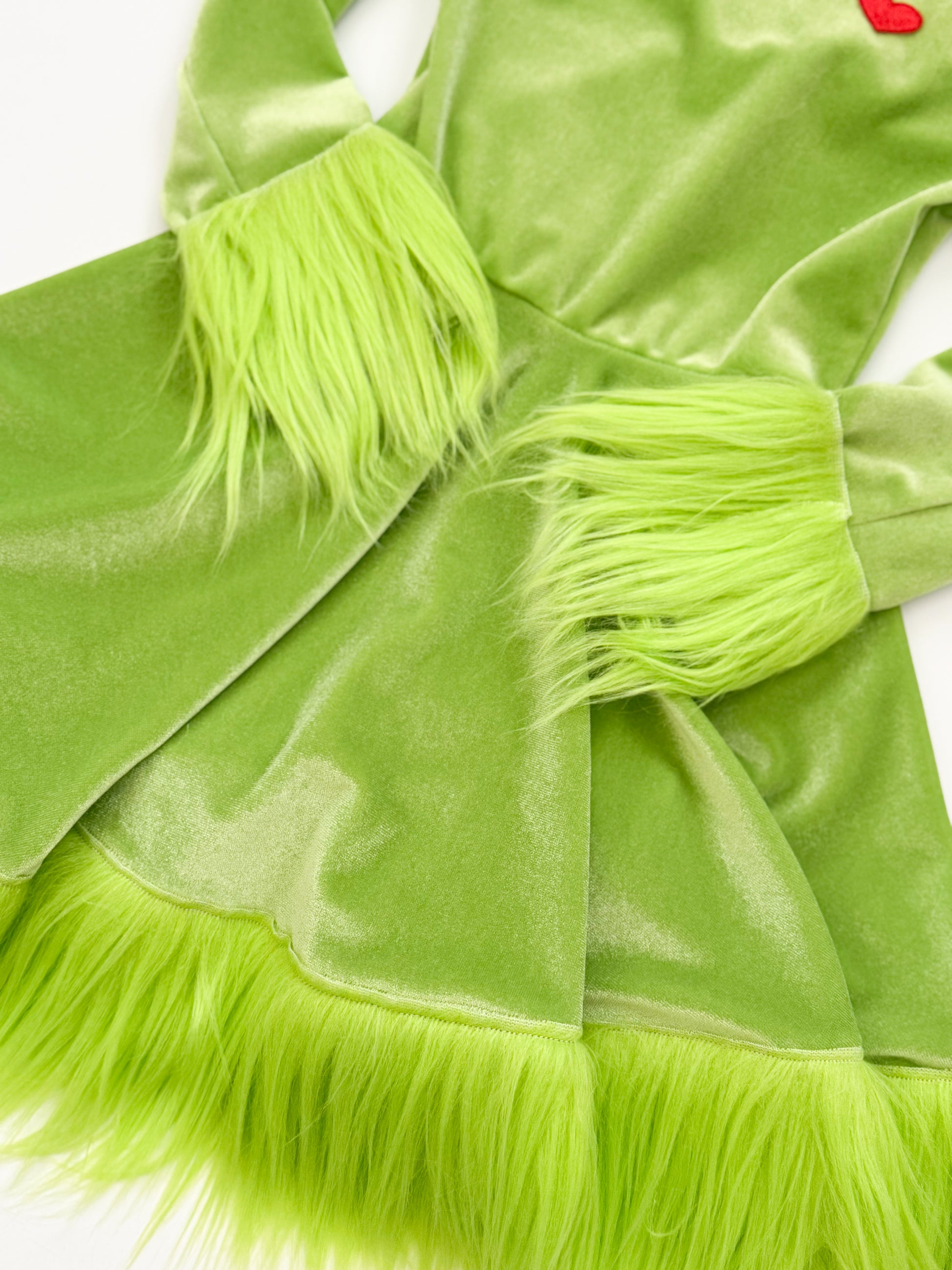 - Embellished with green fur on the skirt & sleeves & a small Heart patch on the chest